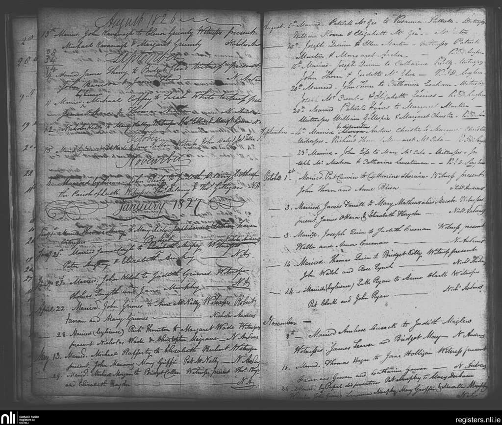 Skerries; County of Dublin; Archdiocese of Dublin. Marriages, Aug. 1826 to Nov. 1827