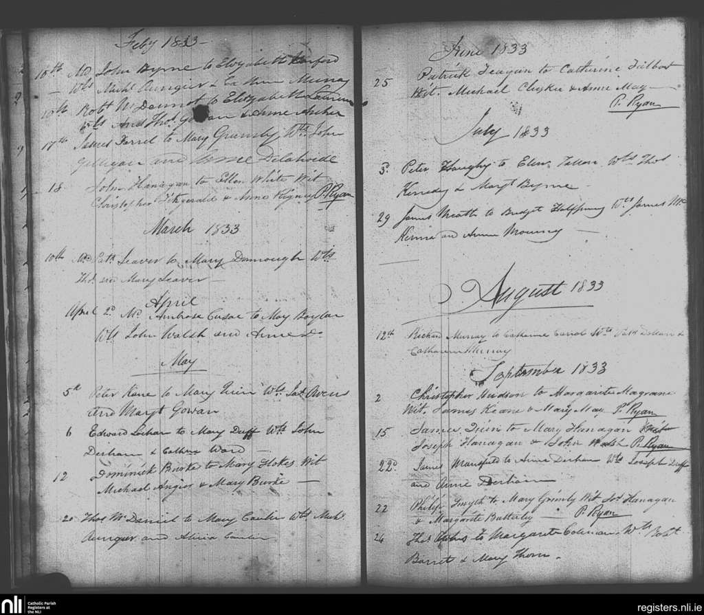 Skerries; County of Dublin; Archdiocese of Dublin. Marriages, Feb. 1833 to Sep. 1833