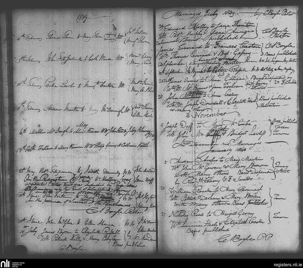 Skerries; County of Dublin; Archdiocese of Dublin. Marriages, Feb. 1839 to Jan. 1840