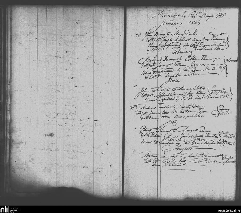 Skerries; County of Dublin; Archdiocese of Dublin. Marriages, Jan. 1846 to Aug. 1846
