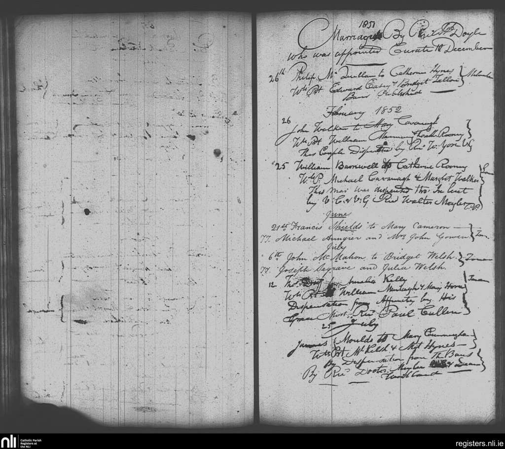 Skerries; County of Dublin; Archdiocese of Dublin. Marriages, Dec. 1851 to July 1852