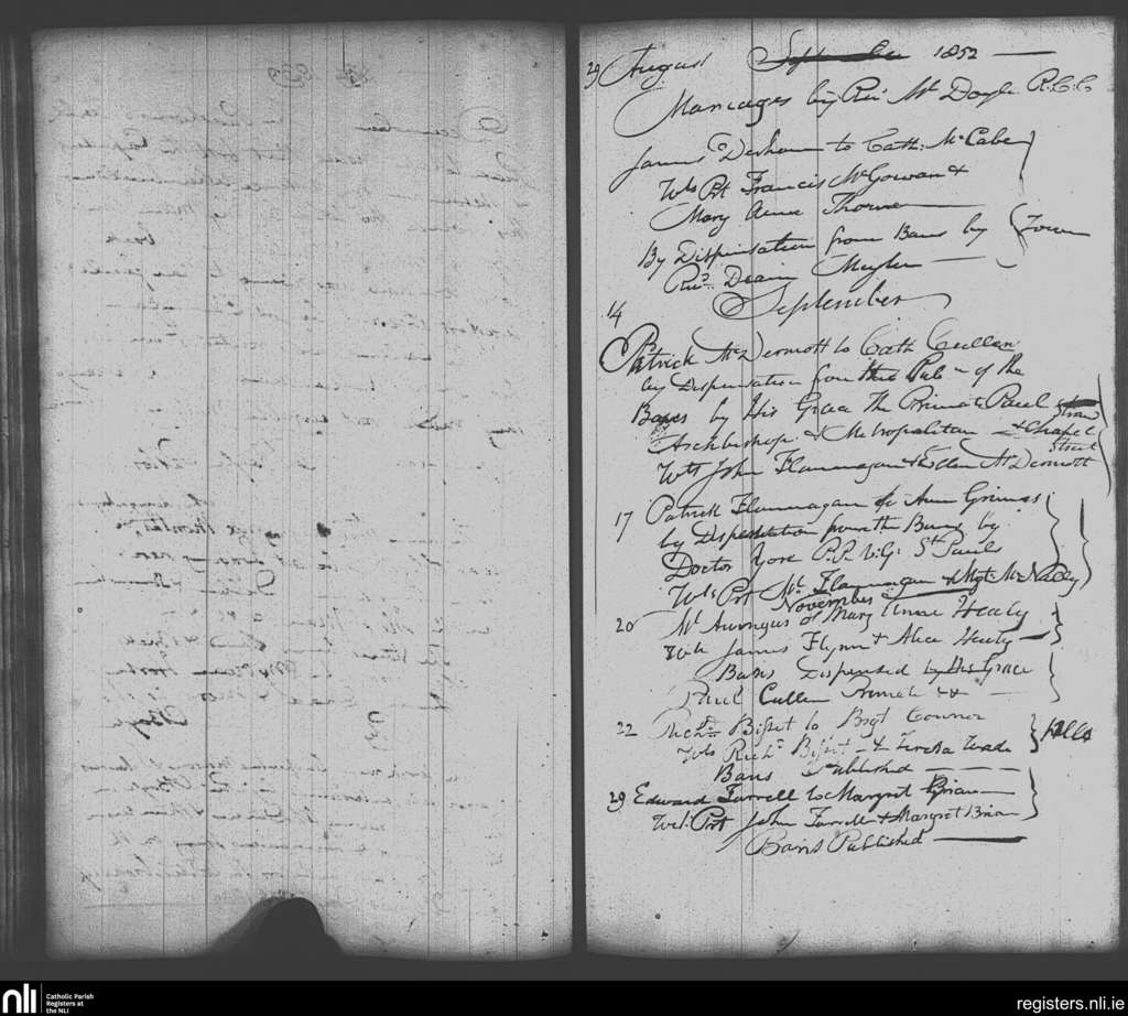 Skerries; County of Dublin; Archdiocese of Dublin. Marriages, Aug. 1852 to Sep. 1852