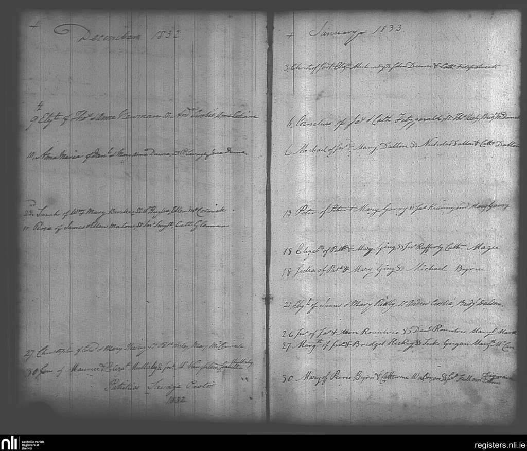 Maynooth; County of Kildare, Dublin; Archdiocese of Dublin. Baptisms, Dec. 1832 to Jan. 1833