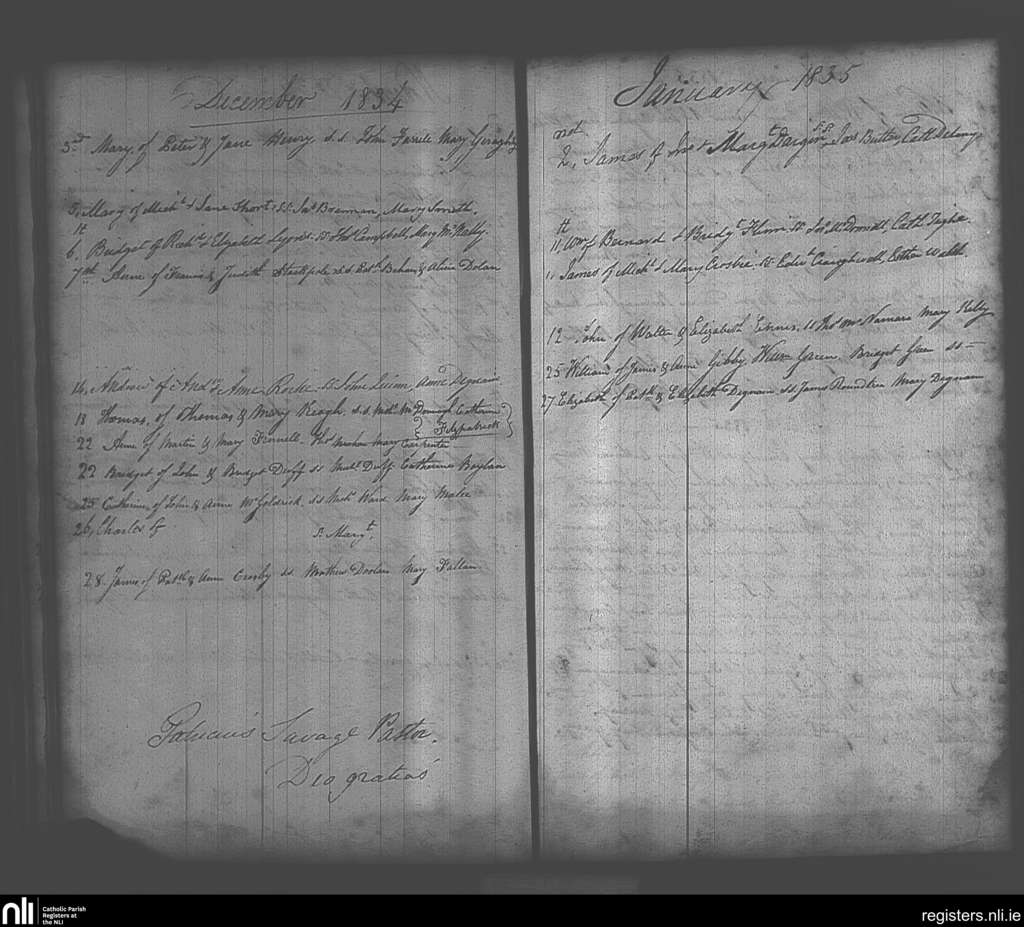 Maynooth; County of Kildare, Dublin; Archdiocese of Dublin. Baptisms, Dec. 1834 to Jan. 1835