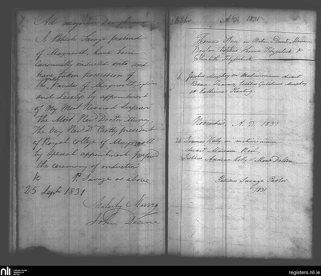 Maynooth; County of Kildare, Dublin; Archdiocese of Dublin. Marriages, Sep. 1831 to Nov. 1831