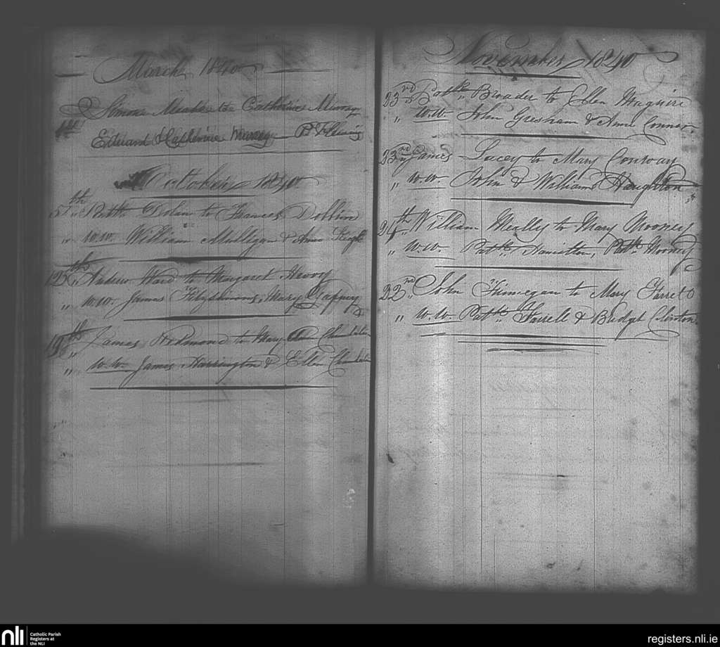 Maynooth; County of Kildare, Dublin; Archdiocese of Dublin. Marriages, Mar. 1840 to Nov. 1840