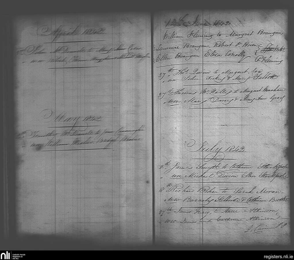 Maynooth; County of Kildare, Dublin; Archdiocese of Dublin. Marriages, Apr. 1842 to July 1842