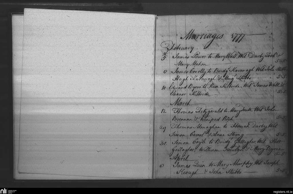 Rathfarnham; County of Dublin; Archdiocese of Dublin. Marriages, Feb. 1777 to Apr. 1777