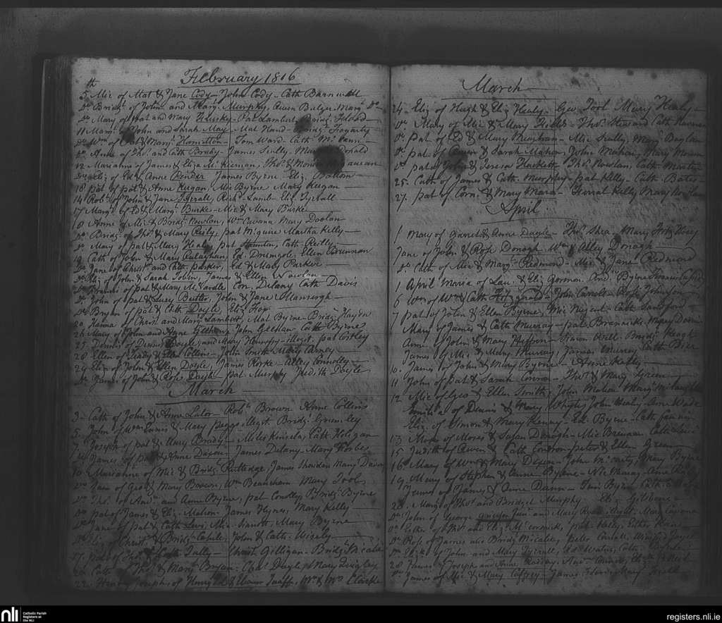 Rathfarnham; County of Dublin; Archdiocese of Dublin. Baptisms, Feb. 1816 to Apr. 1816