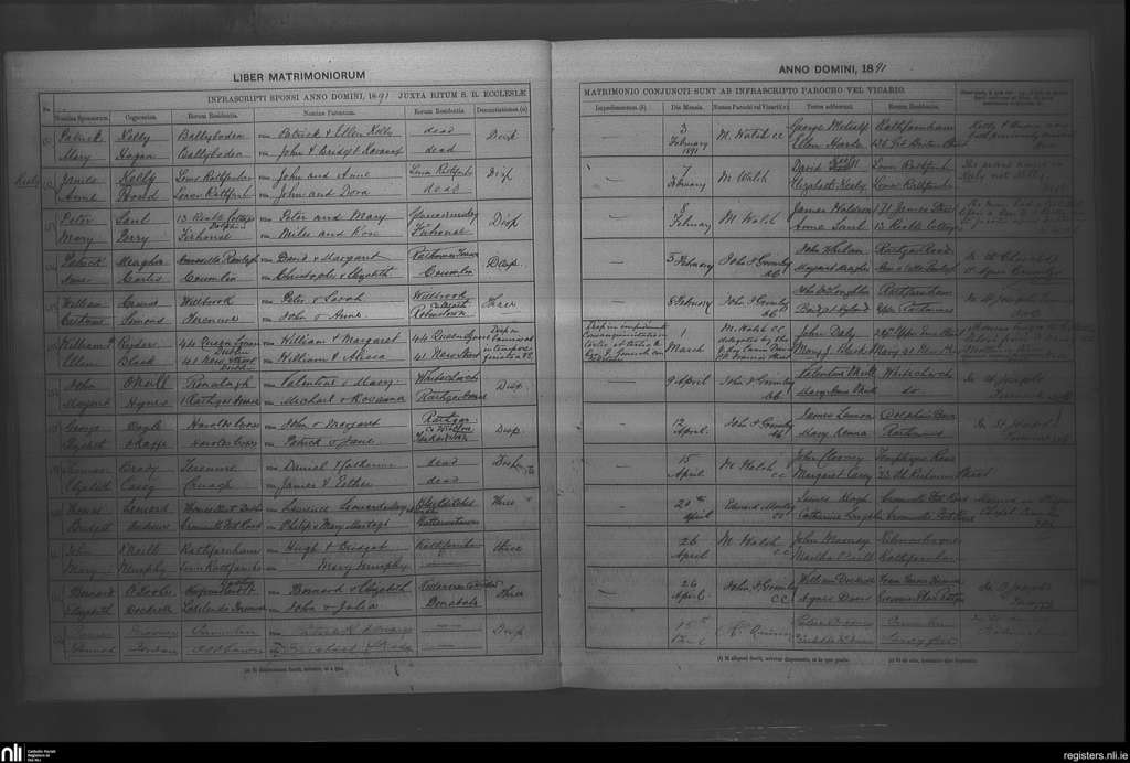 Rathfarnham; County of Dublin; Archdiocese of Dublin. Marriages, Feb. 1891 to Apr. 1891