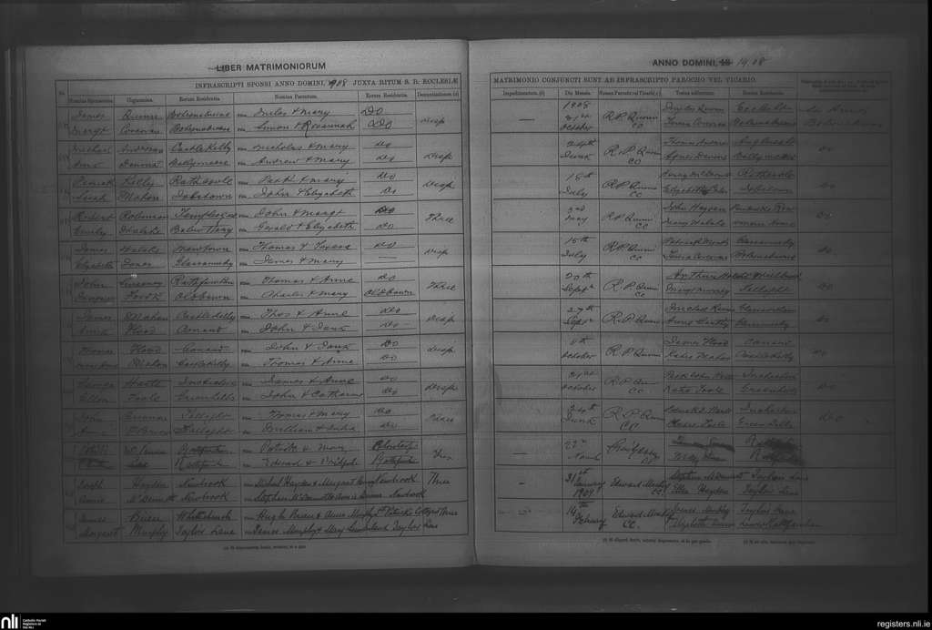 Rathfarnham; County of Dublin; Archdiocese of Dublin. Marriages, May 1908 to Feb. 1909