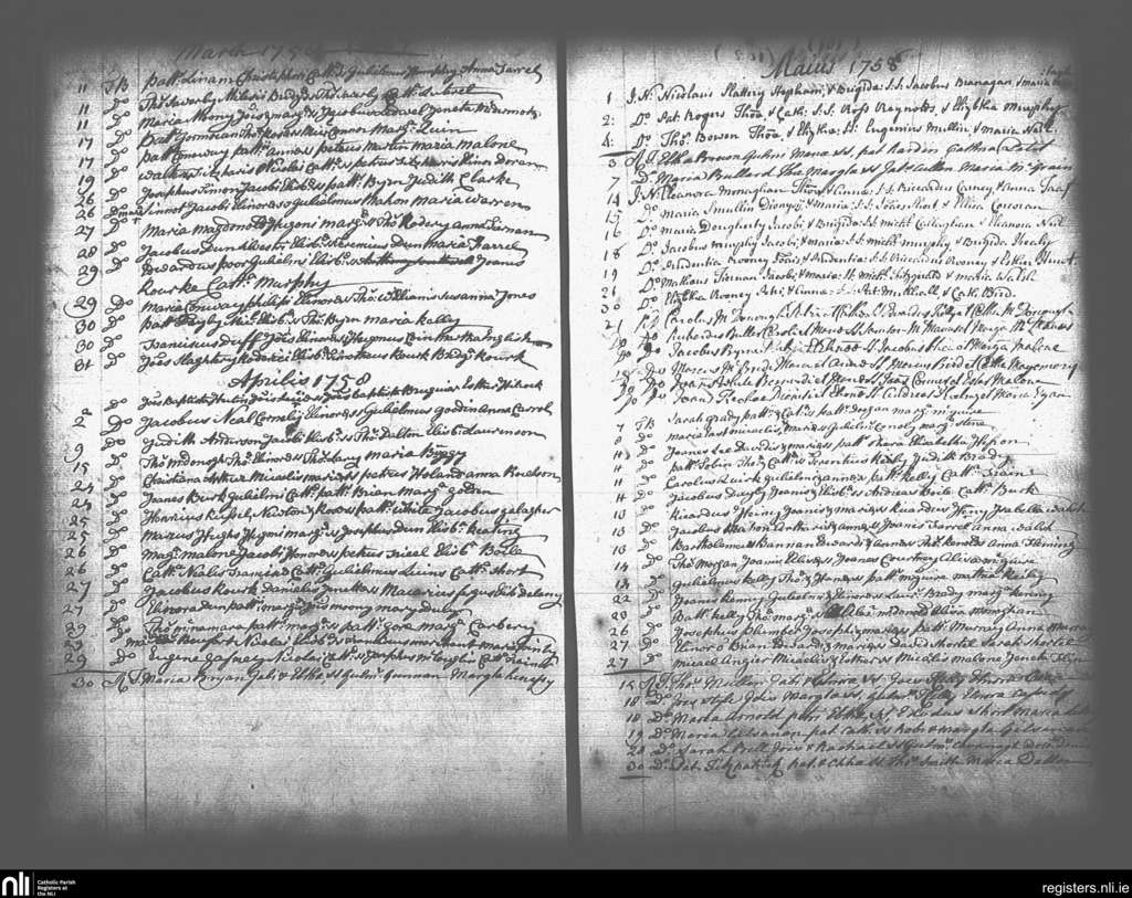 St. Andrew's, Dublin city; County of Dublin; Archdiocese of Dublin. Baptisms, Mar. 1758 to May 1758