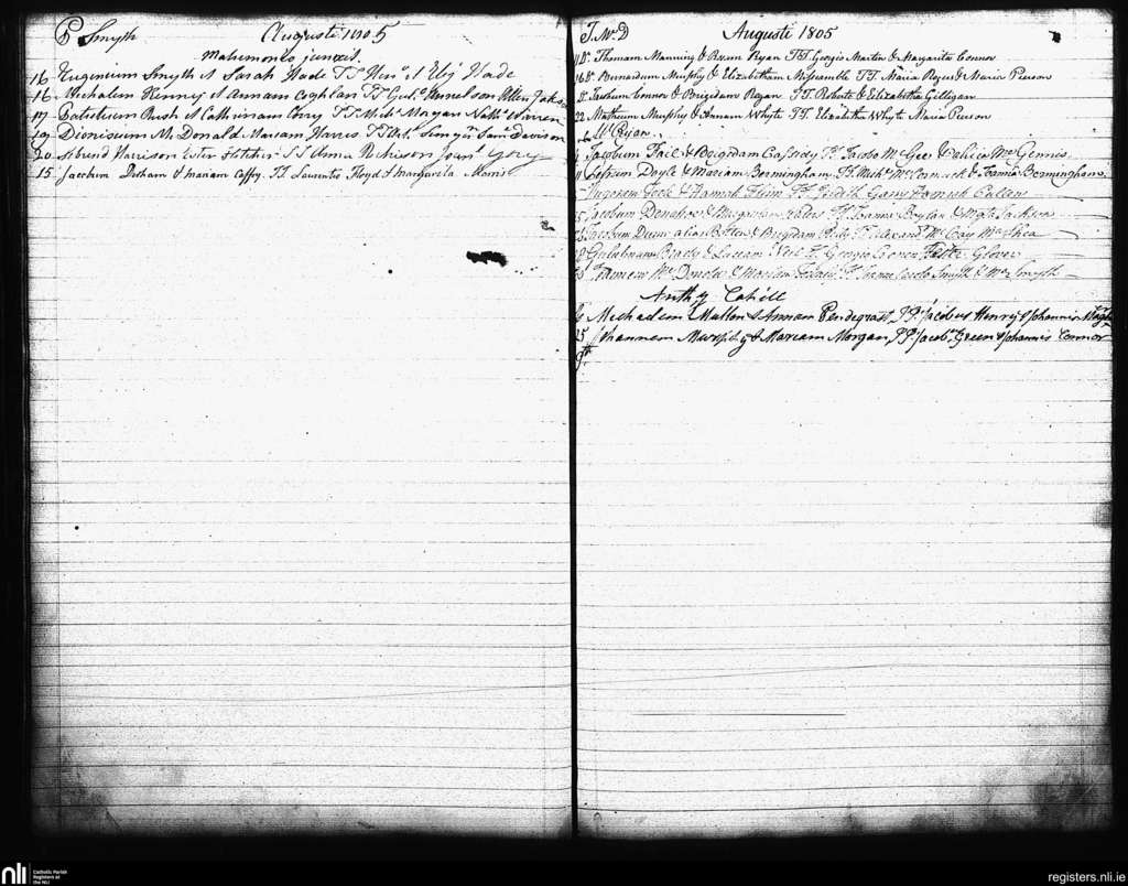 St. Andrew's, Dublin city; County of Dublin; Archdiocese of Dublin. Marriages, Aug. 1805