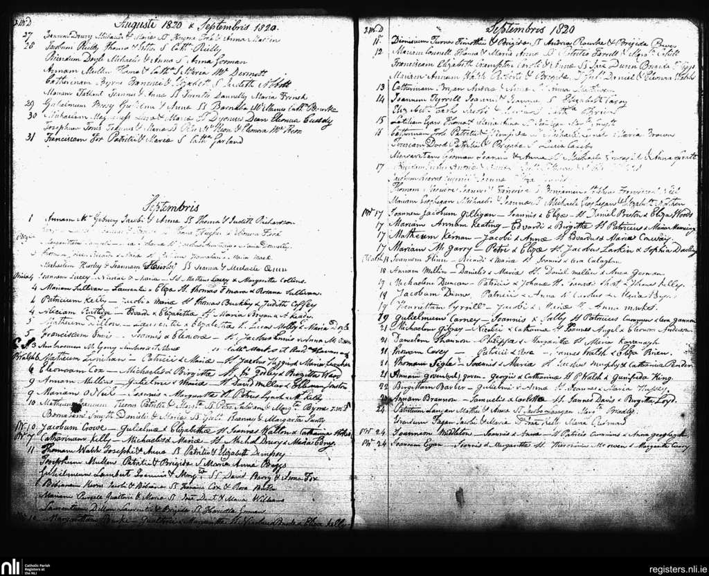 St. Andrew's, Dublin city; County of Dublin; Archdiocese of Dublin. Baptisms, Aug. 1820 to Sep. 1820