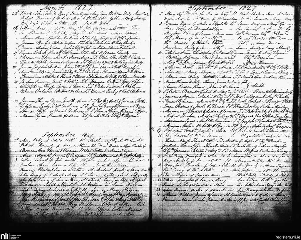 St. Andrew's, Dublin city; County of Dublin; Archdiocese of Dublin. Baptisms, Aug. 1827 to Sep. 1827