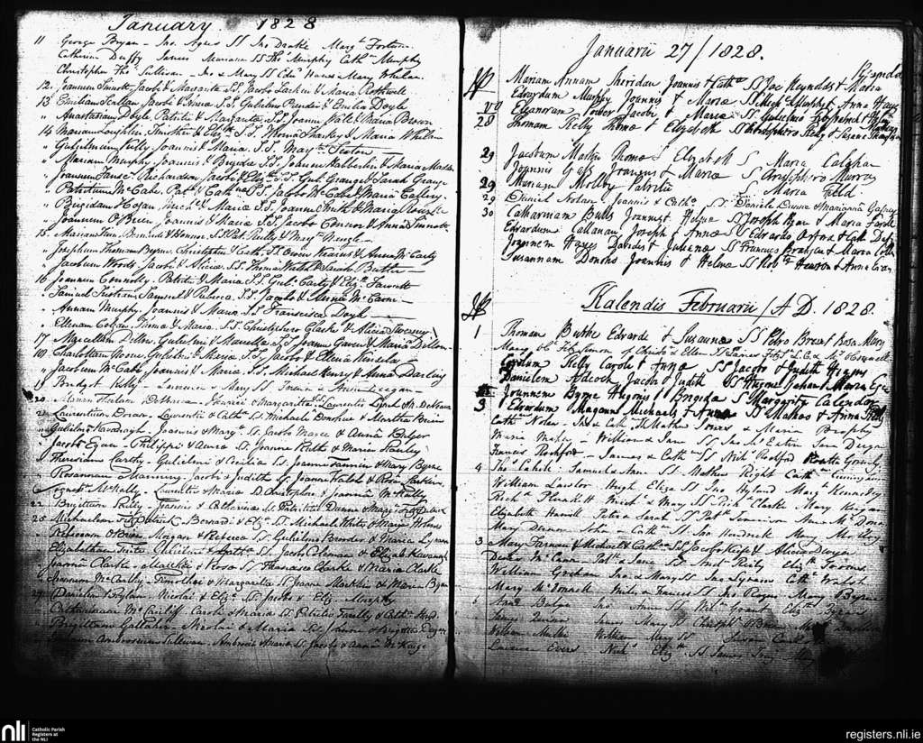 St. Andrew's, Dublin city; County of Dublin; Archdiocese of Dublin. Baptisms, Jan. 1828 to Feb. 1828
