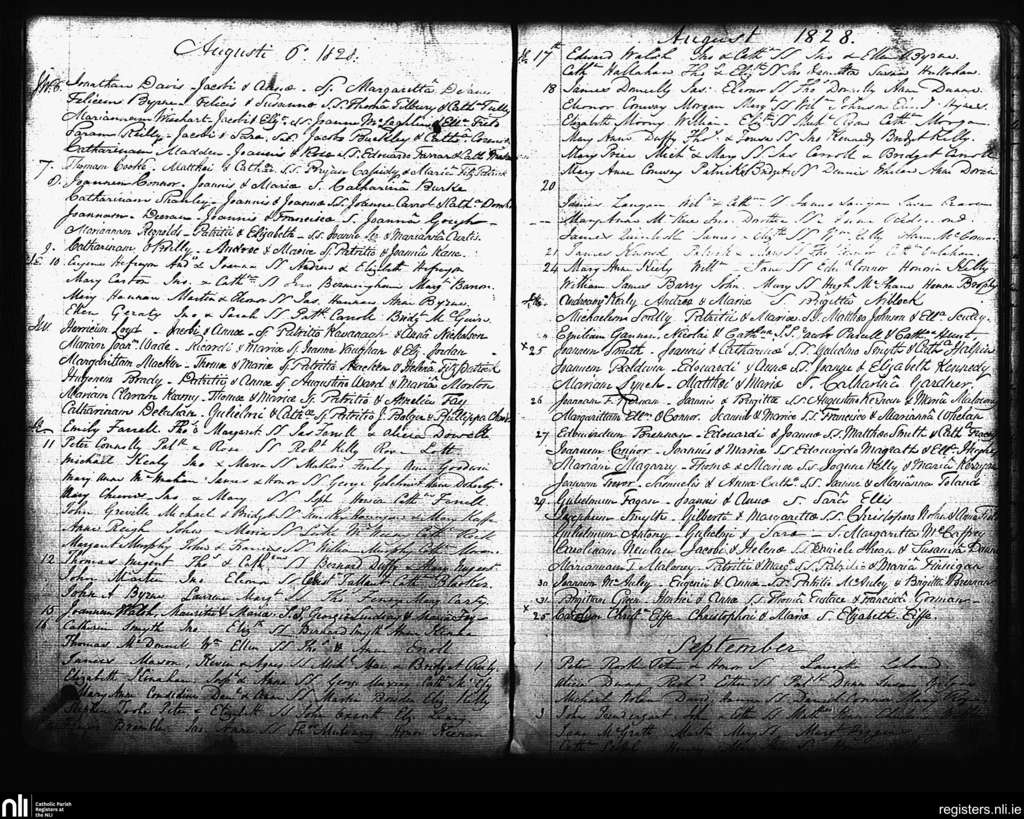 St. Andrew's, Dublin city; County of Dublin; Archdiocese of Dublin. Baptisms, Aug. 1828 to Sep. 1828