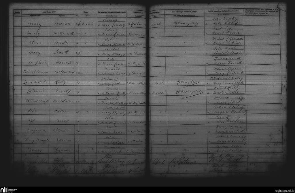 St. Andrew's, Dublin city; County of Dublin; Archdiocese of Dublin. Baptisms, Mar. 1871 to Apr. 1871