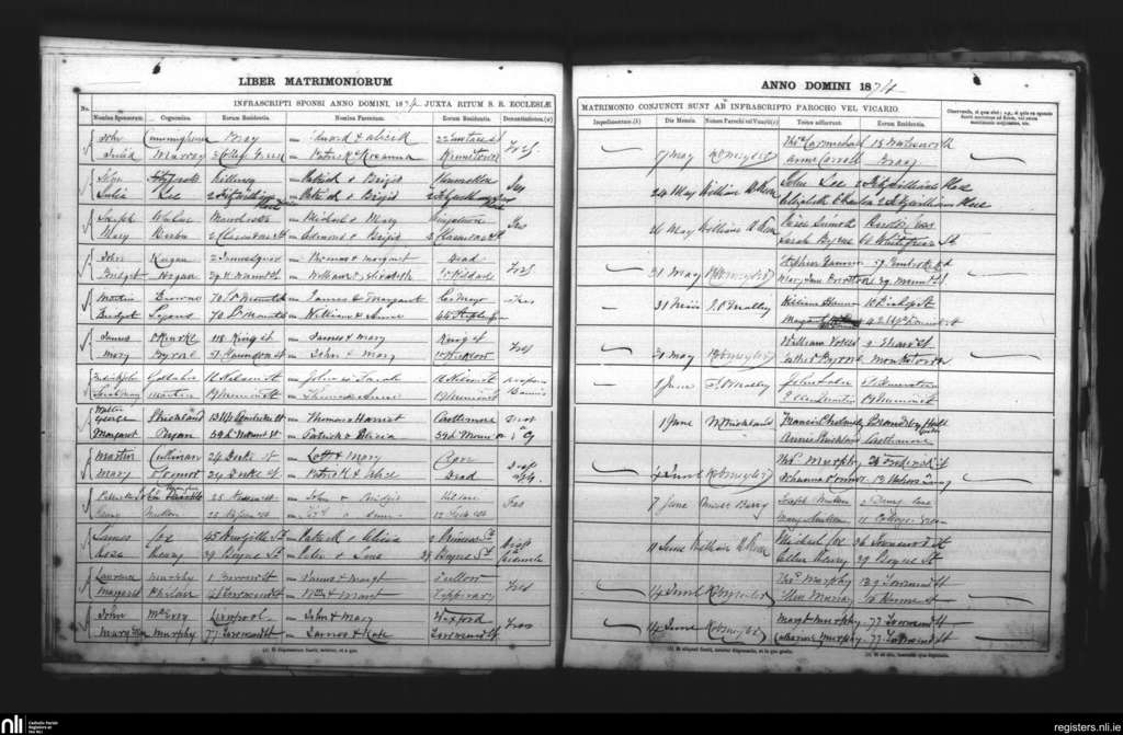 St. Andrew's, Dublin city; County of Dublin; Archdiocese of Dublin. Marriages, May 1874 to June 1874