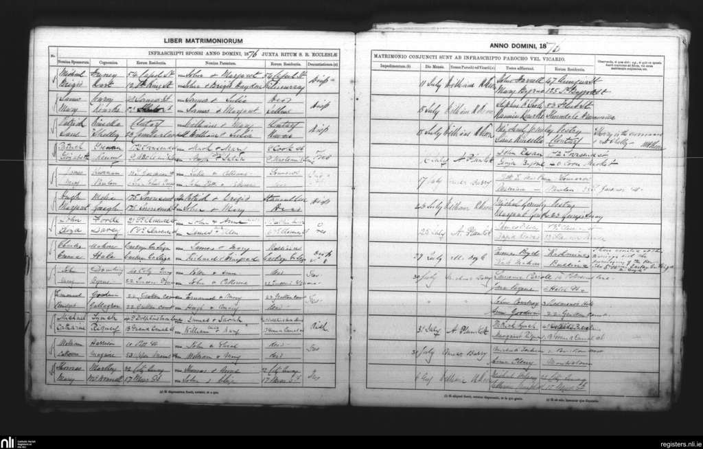 St. Andrew's, Dublin city; County of Dublin; Archdiocese of Dublin. Marriages, July 1876 to Aug. 1876