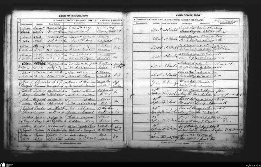 St. Andrew's, Dublin city; County of Dublin; Archdiocese of Dublin. Marriages, Sep. 1880 to Oct. 1880