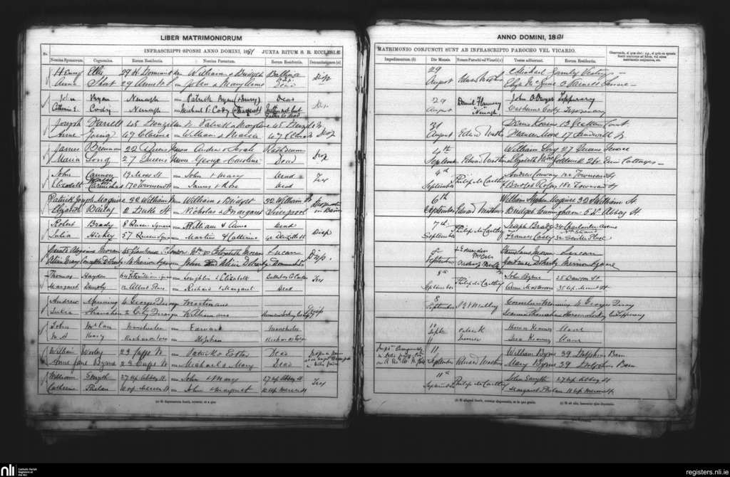 St. Andrew's, Dublin city; County of Dublin; Archdiocese of Dublin. Marriages, Aug. 1881 to Sep. 1881