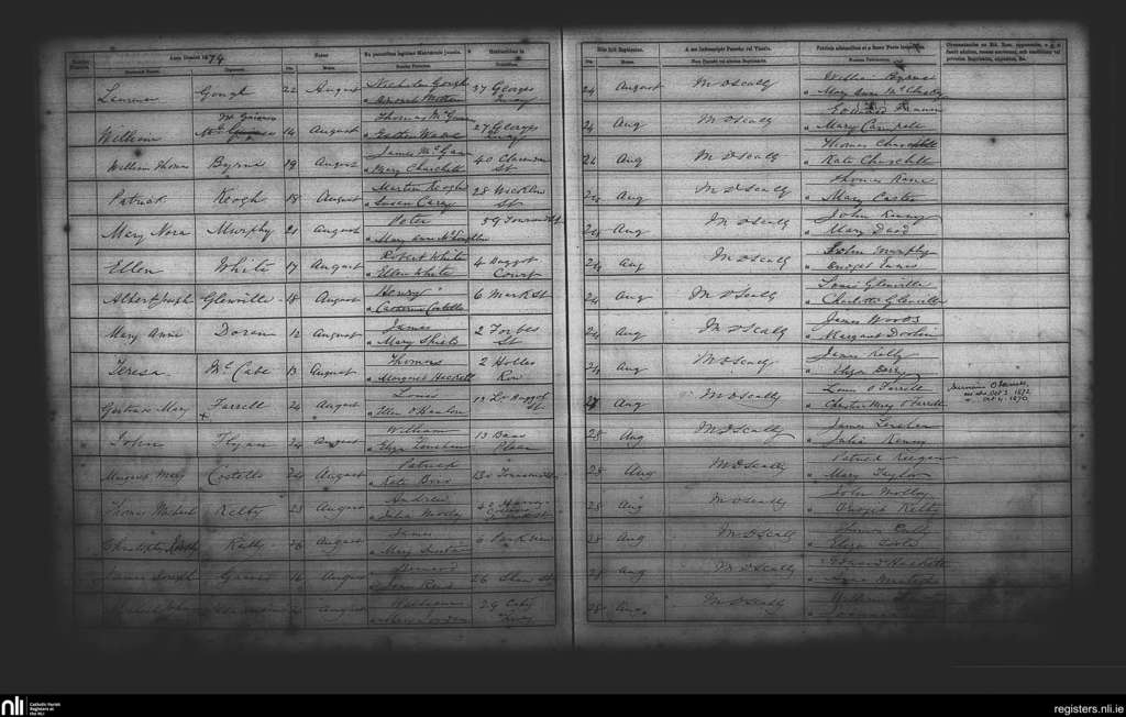 St. Andrew's, Dublin city; County of Dublin; Archdiocese of Dublin. Baptisms, Aug. 1874