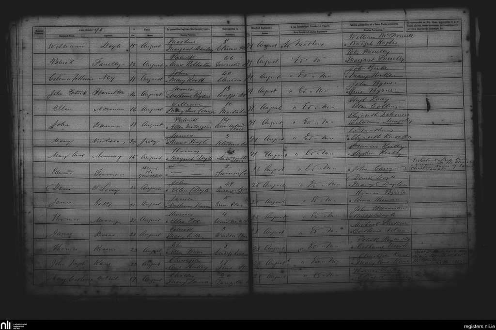St. Andrew's, Dublin city; County of Dublin; Archdiocese of Dublin. Baptisms, Aug. 1876