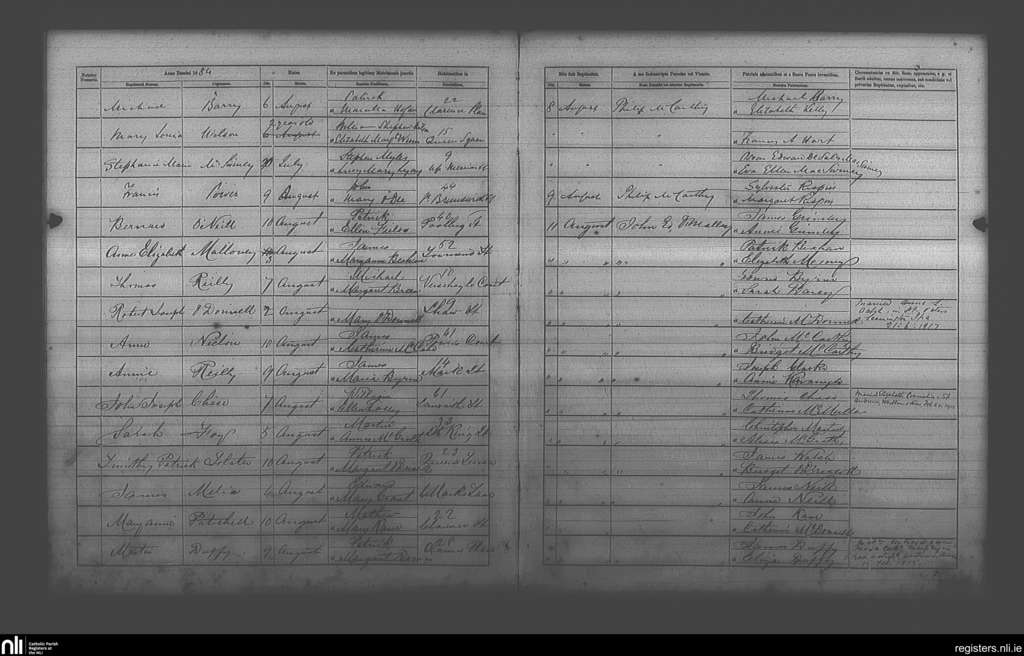 St. Andrew's, Dublin city; County of Dublin; Archdiocese of Dublin. Baptisms, Aug. 1884