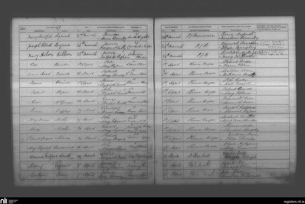 St. Andrew's, Dublin city; County of Dublin; Archdiocese of Dublin. Baptisms, Mar. 1887 to Apr. 1887