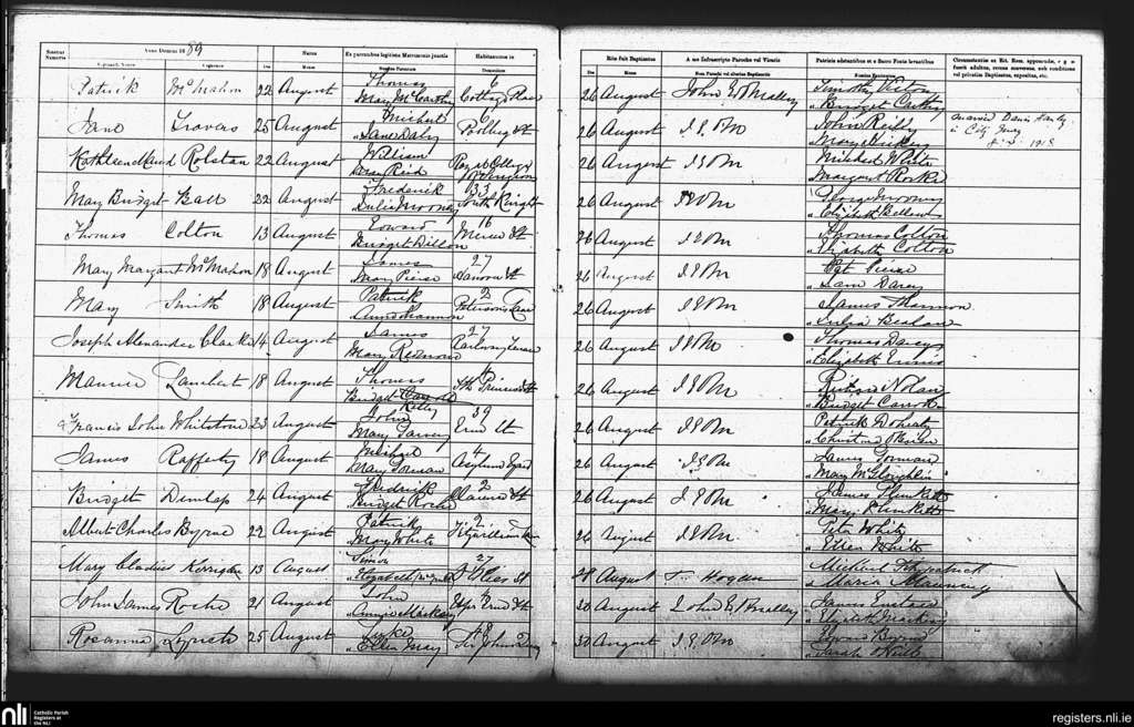 St. Andrew's, Dublin city; County of Dublin; Archdiocese of Dublin. Baptisms, Aug. 1889