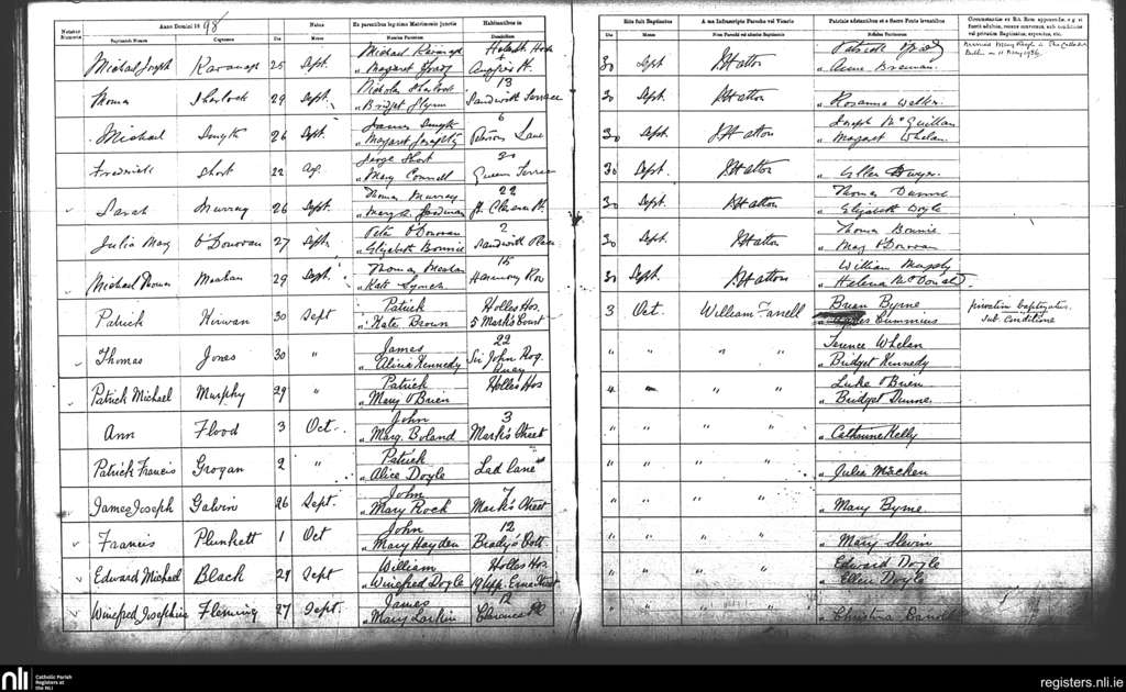 St. Andrew's, Dublin city; County of Dublin; Archdiocese of Dublin. Baptisms, Sep. 1898 to Oct. 1898