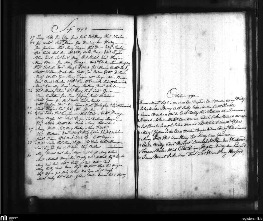 St. Catherine's, Dublin city; County of Dublin; Archdiocese of Dublin. Baptisms, Sep. 1792 to Oct. 1792
