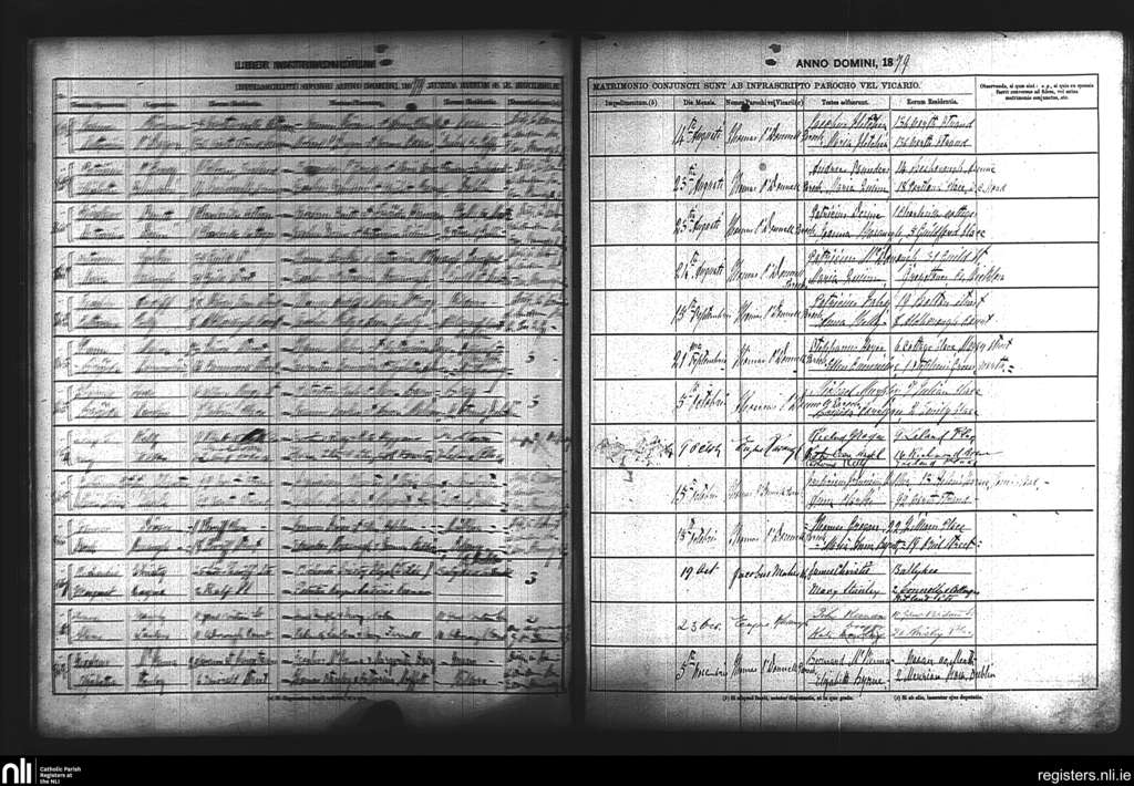 St. Laurence O'Toole's, Dublin city; County of Dublin; Archdiocese of Dublin. Marriages, Aug. 1879 to Nov. 1879
