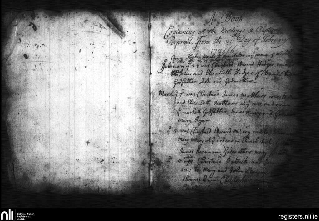 St. Michan's, Dublin city; County of Dublin; Archdiocese of Dublin. Baptisms, Marriages, Feb. 1726 to Mar. 1726