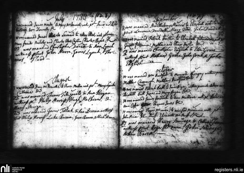 St. Michan's, Dublin city; County of Dublin; Archdiocese of Dublin. Marriages, July 1733 to Oct. 1733