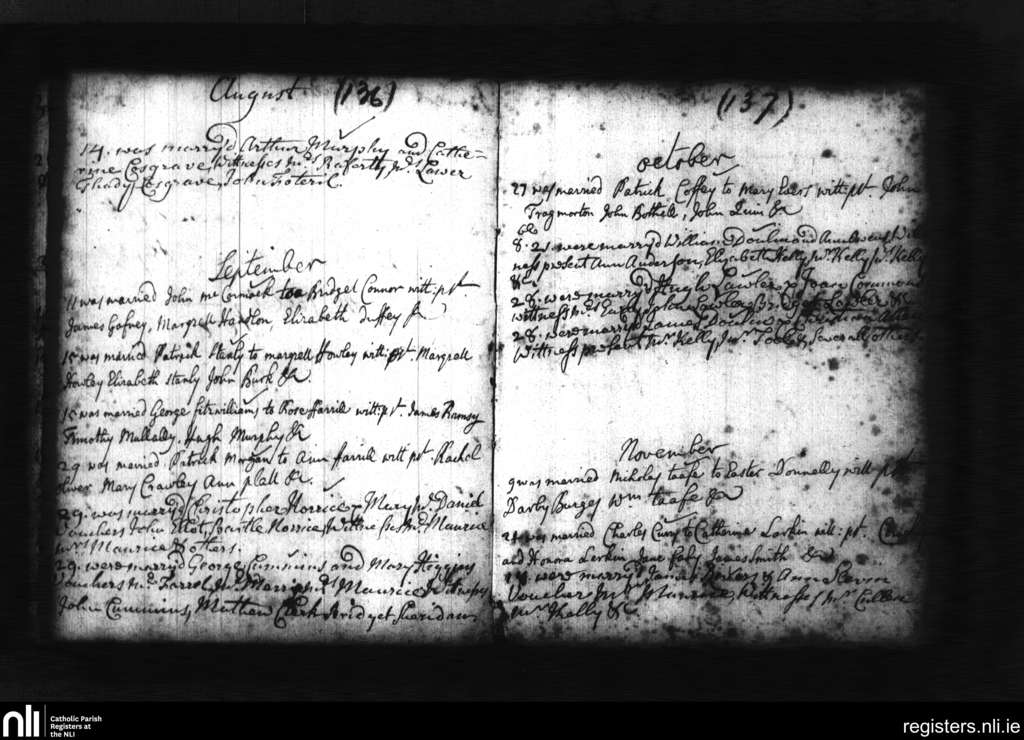 St. Michan's, Dublin city; County of Dublin; Archdiocese of Dublin. Marriages, Aug. 1734 to Nov. 1734