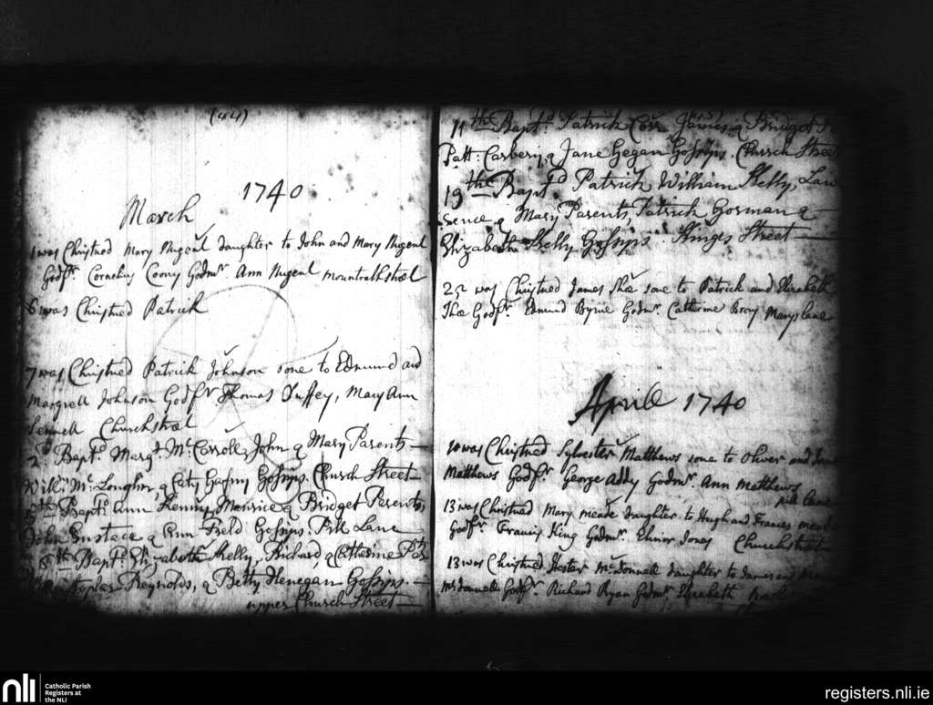 St. Michan's, Dublin city; County of Dublin; Archdiocese of Dublin. Baptisms, Mar. 1740 to Apr. 1740