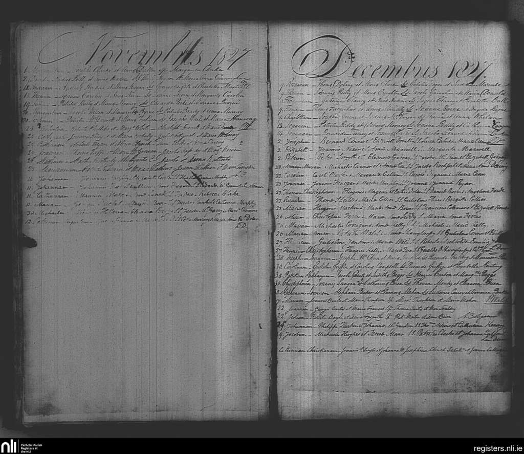 St. Michan's, Dublin city; County of Dublin; Archdiocese of Dublin. Baptisms, Nov. 1827 to Dec. 1827