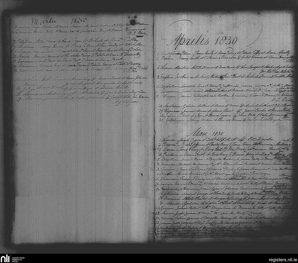 St. Michan's, Dublin city; County of Dublin; Archdiocese of Dublin. Baptisms, Mar. 1830 to May 1830