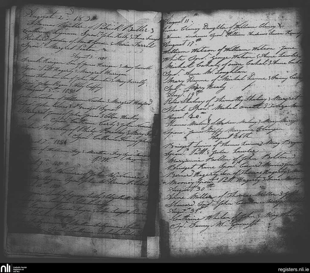 St. Michan's, Dublin city; County of Dublin; Archdiocese of Dublin. Baptisms, Aug. 1830