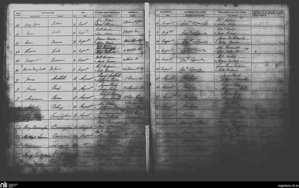 St. Michan's, Dublin city; County of Dublin; Archdiocese of Dublin. Baptisms, Aug. 1854