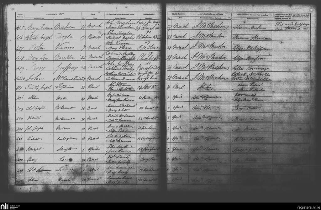 St. Michan's, Dublin city; County of Dublin; Archdiocese of Dublin. Baptisms, Mar. 1855 to Apr. 1855