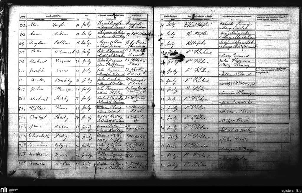 St. Michan's, Dublin city; County of Dublin; Archdiocese of Dublin. Baptisms, July 1882