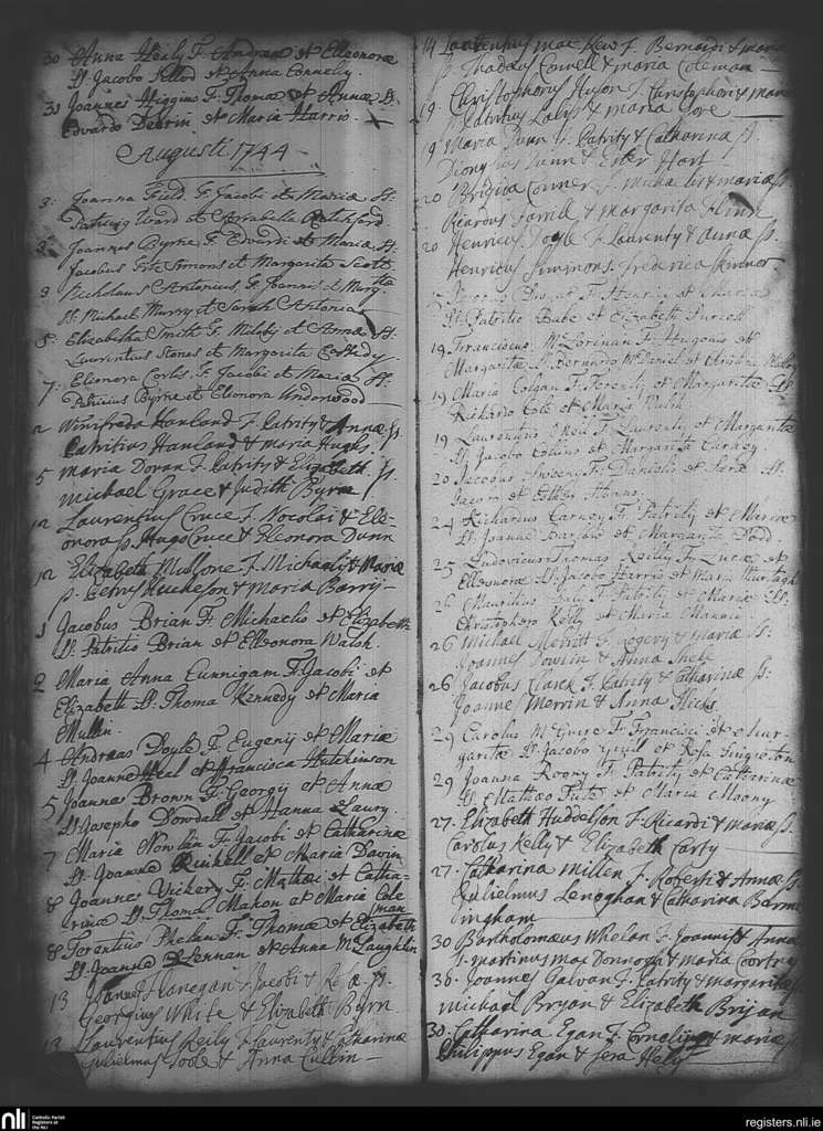 St. Nicholas', Dublin city; County of Dublin; Archdiocese of Dublin. Baptisms, July 1744 to Aug. 1744