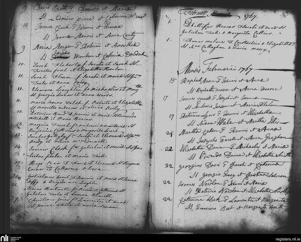 St. Nicholas', Dublin city; County of Dublin; Archdiocese of Dublin. Baptisms, Feb. 1767