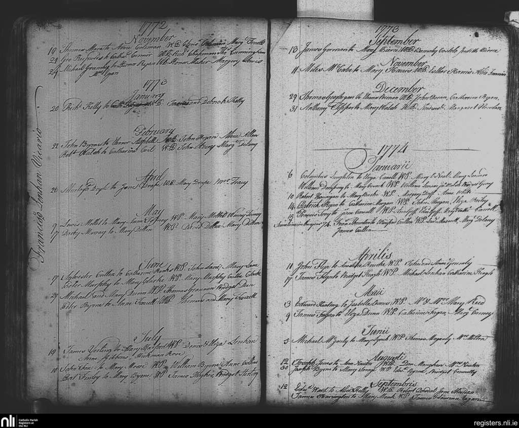 St. Nicholas', Dublin city; County of Dublin; Archdiocese of Dublin. Marriages, Nov. 1772 to Sep. 1774
