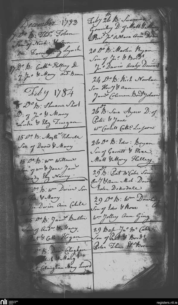 St. Nicholas', Dublin city; County of Dublin; Archdiocese of Dublin. Baptisms, Dec. 1783 to Feb. 1784