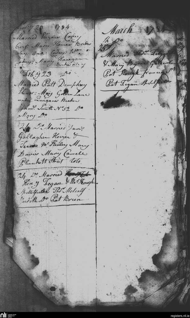 St. Nicholas', Dublin city; County of Dublin; Archdiocese of Dublin. Marriages, Feb. 1784 to Mar. 1784