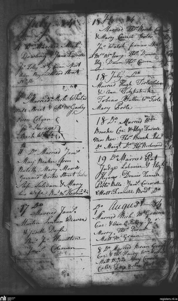 St. Nicholas', Dublin city; County of Dublin; Archdiocese of Dublin. Marriages, July 1784 to Aug. 1784